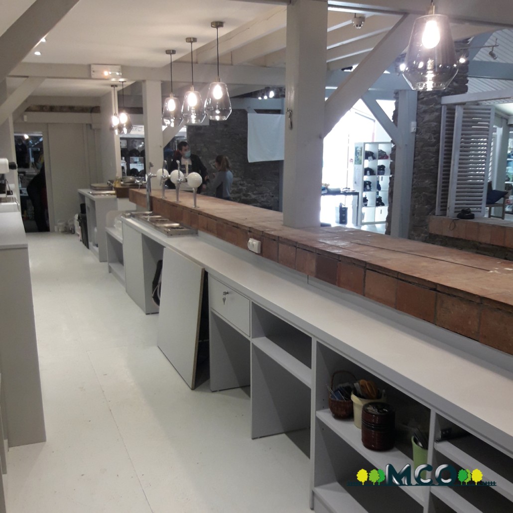 Et c’est justement pour ce restaurant que nos équipes sont intervenues ! MCO a ainsi réalisé l’aménagement d’un arrière bar en aggloméré hydrofuge stratifié gris avec un fond rétroéclairé en polycarbonate blanc diffusant.